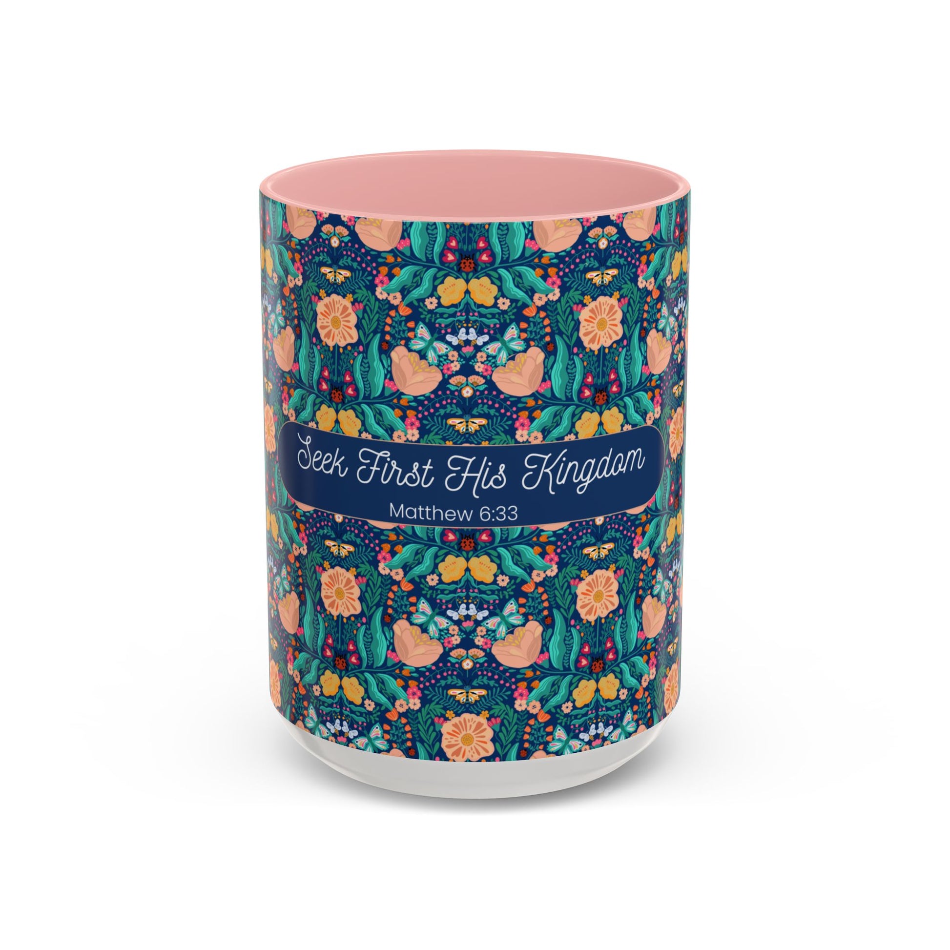 Inspirational Floral Accent Coffee Mug - Seek First His Kingdom - Matthew 6:33
