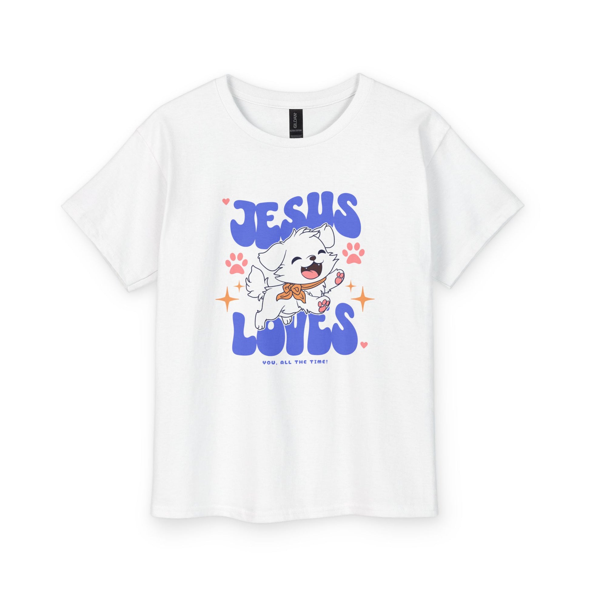 Let your little one jump for joy in this adorable "Jesus Loves You" tee featuring the happiest puppy ever! With playful retro lettering in purple, pink paw prints, and golden stars, this design radiates pure love and happiness. The sweet message "Jesus Loves You, All the Time!" reminds your child that Jesus' love never stops—not even for a second!